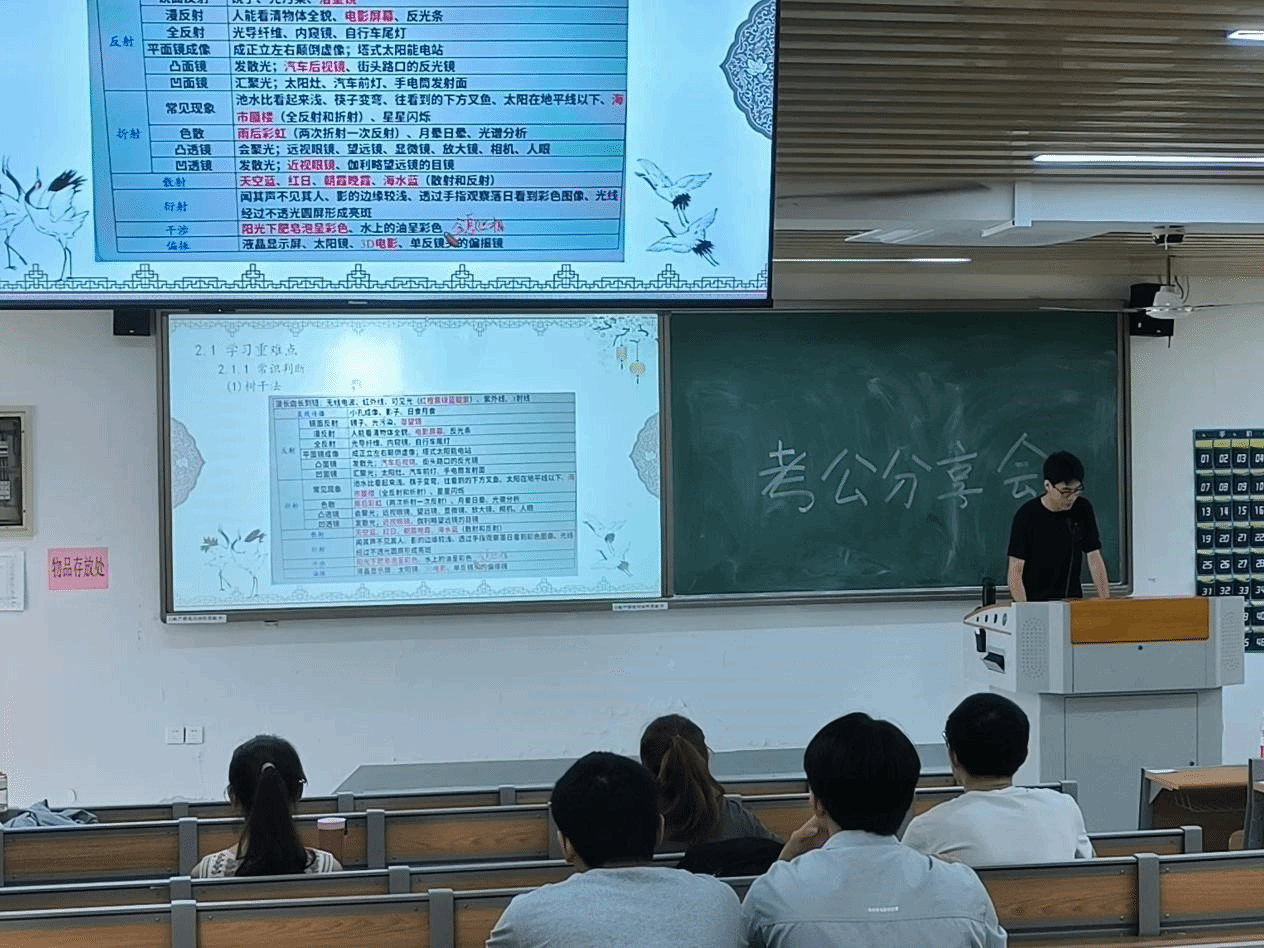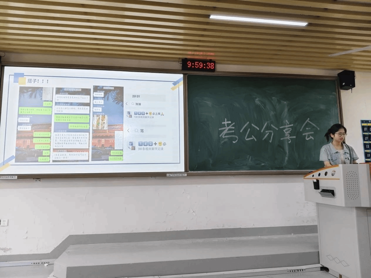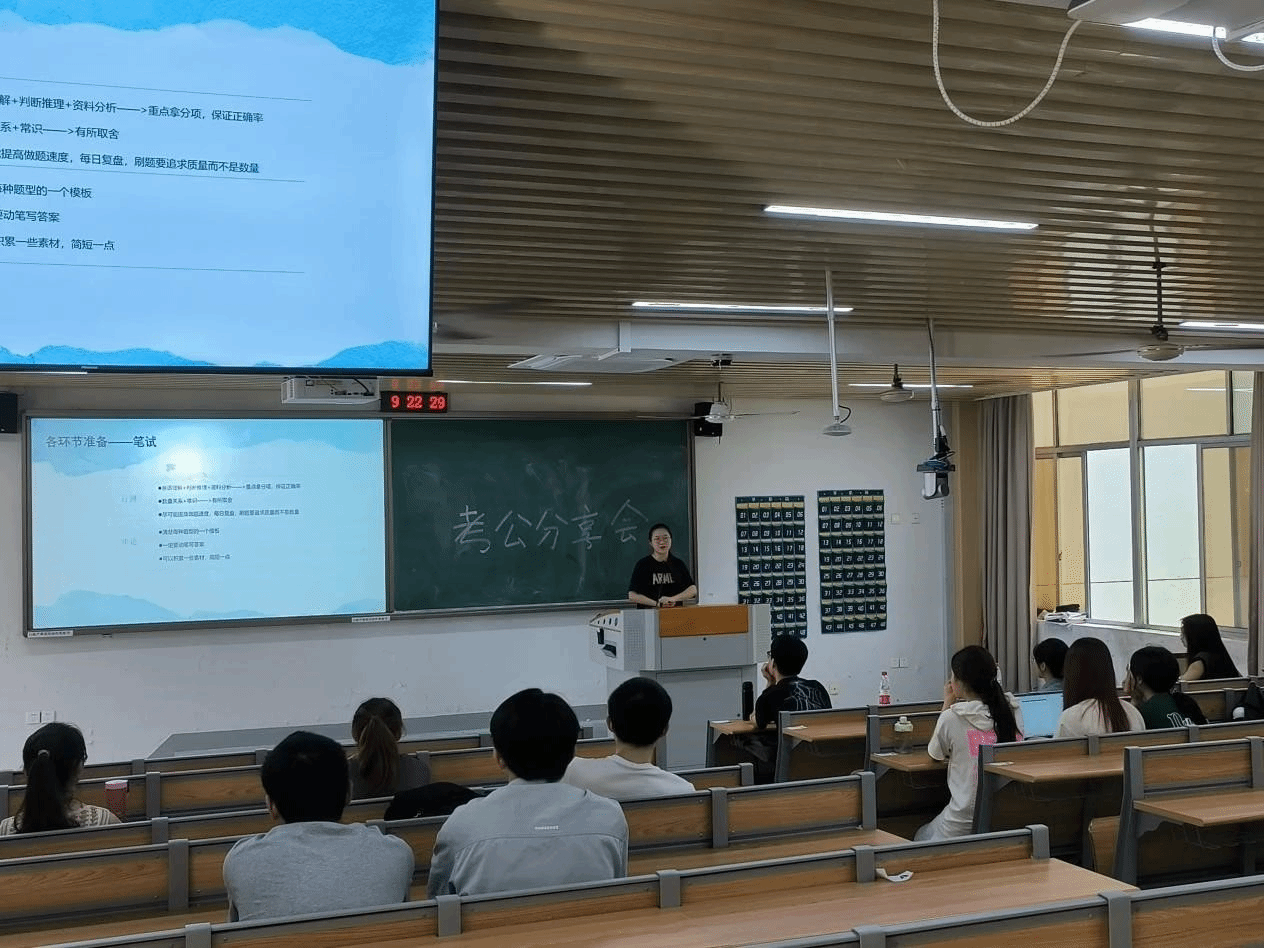 黄珊玲、刘婕及陈源宇三位同学对考公流程及各环节起止时间进行了基本介绍。他们以自身的备考情况为同学们时间规划提供了参考,并针对各个模块的备考给出了针对性的学习建议。他们表示,考公的过程中一定要放平心态,就业的选择有很多种,不止考公一种,但也要相信天道酬勤,努力终有收获。