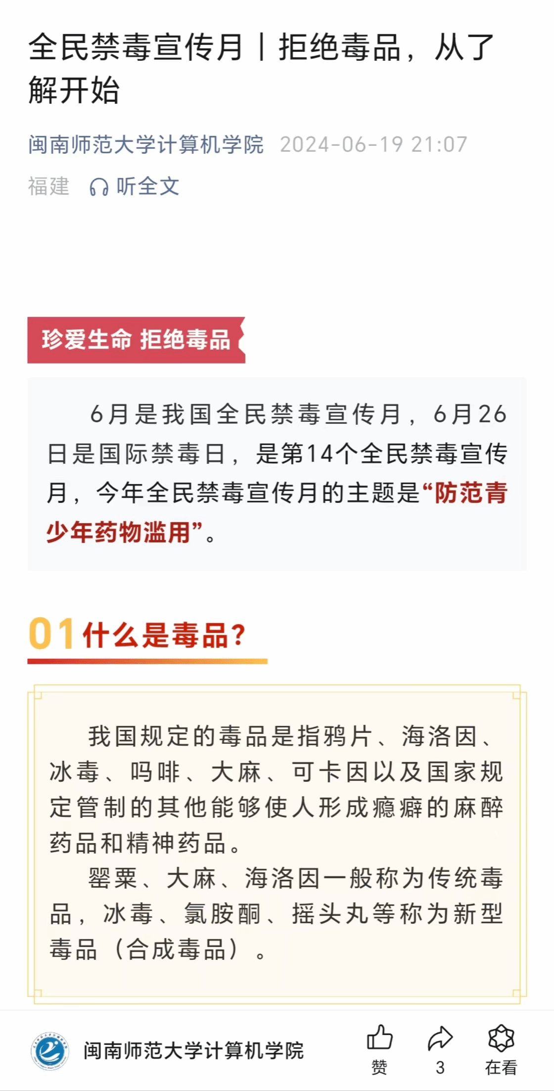 为了提升学生对毒品危害的认识与防范意识,进一步推进全民禁毒工作,学院于公众号平台上开展一系列线上禁毒知识宣传教育,从“什么是毒品”到“学习预防措施和自我保护”,旨在能够增强同学们对禁毒知识的了解,提高全民禁毒意识,共建无毒校园。