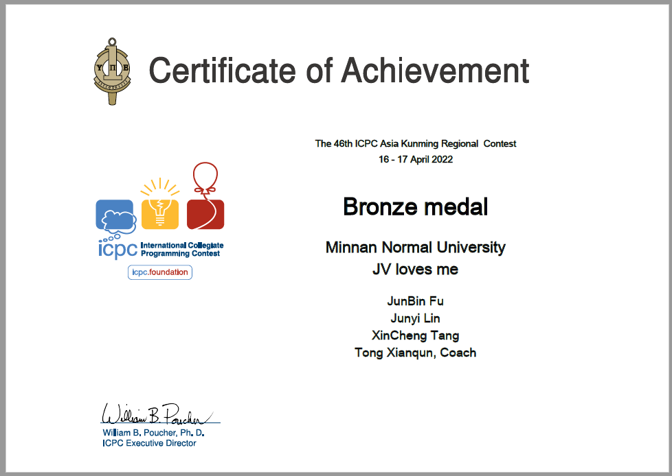 4月16-17日,2022年第46届ICPC国际大学生程序设计竞赛亚洲区域赛昆明站比赛顺利举行,比赛采用线上方式。有来自清华大学、北京大学、南京大学等各个高校的697个队伍共2091名同学参赛。我校3044永利集团官网ACM队员唐鑫程、林俊逸、傅俊斌,3名同学组成的队伍在比赛中发挥出色,获得铜奖。