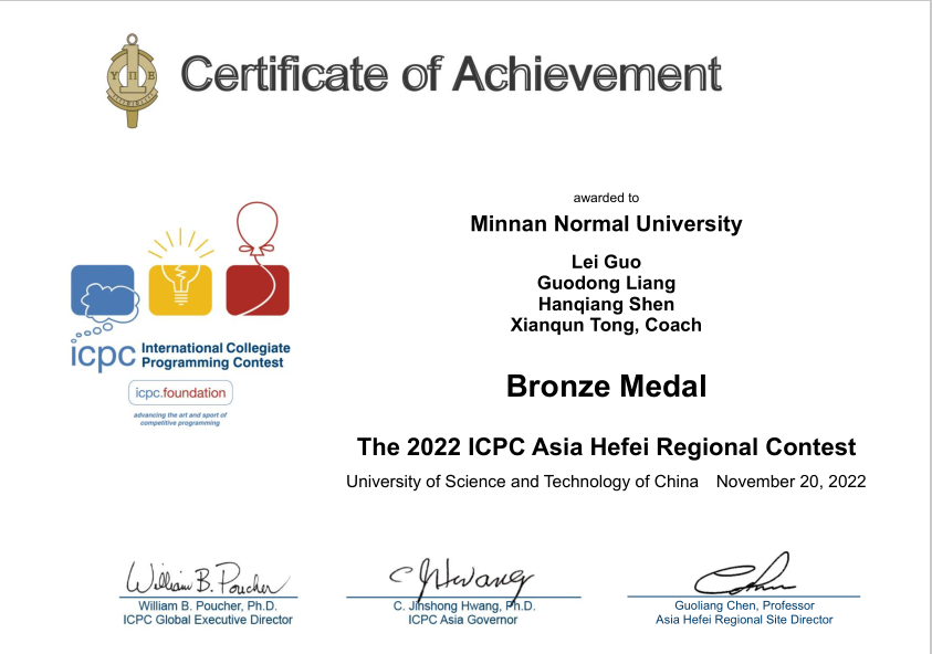 11月19-20日,2022年第46届ICPC国际大学生程序设计竞赛亚洲区域赛合肥站比赛举行。有来自清华大学、北京大学、南京大学等266所高校的502个队伍共1506名同学参赛。我校3044永利集团官网ACM队员沈汉强、梁国栋、郭雷,3名同学组成的队伍在比赛中再获铜奖。