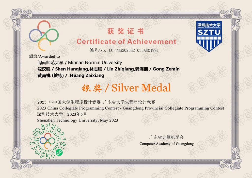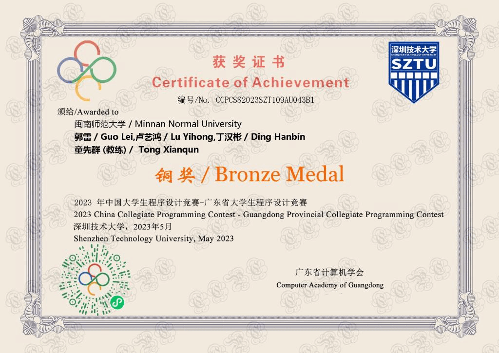 2023年5月13-14日,由广东省计算机学会主办,深圳技术大学承办的“第二十届广东省大学生程序设计竞赛暨中国大学生程序设计竞赛广东省赛(GDCPC)”在深圳技术大学隆重举办。此次比赛,吸引了来自中山大学、华南理工大学、哈尔滨工业大学(深圳)、香港中文大学(深圳)、武汉大学、华中科技大学、厦门大学、山东大学、同济大学等50多所高校242支队伍参赛。在5个小时的比赛中,各参赛队伍围绕13道题目展开角逐,每支队伍只使用一台电脑,充分考验了队员们的思维能力、编程能力和团队协作能力。我院共派出3只队伍参赛,队员们通力合作、顽强拼搏,最终斩获一银一铜。