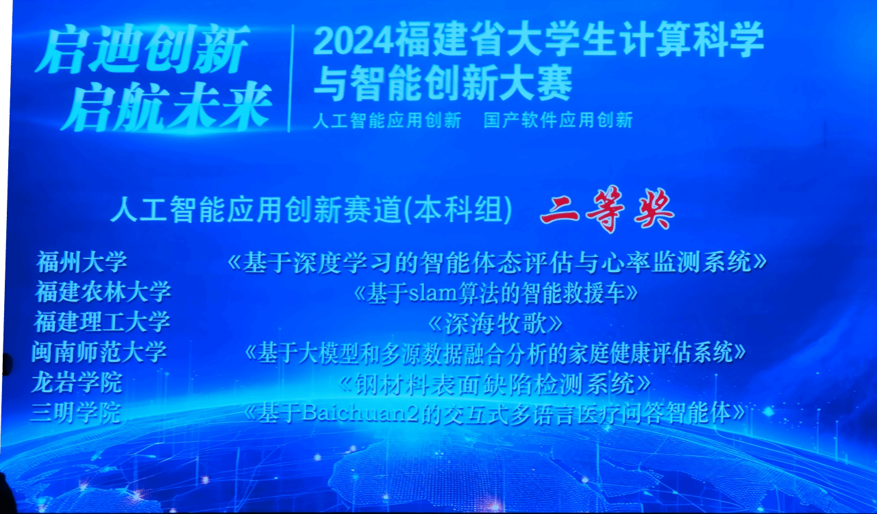 10月27日,由福建省教育厅主办的2024年福建省大学生计算科学与智能创新大赛决赛正式举行。我院2021级数据科学与大数据技术专业的程庚、李哲涵、叶永康团队,在郑艺峰老师、张文杰老师指导下,凭借参赛作品《基于大模型和多源数据融合分析的家庭健康评估系统》荣获人工智能应用创新赛道(本科组)二等奖。