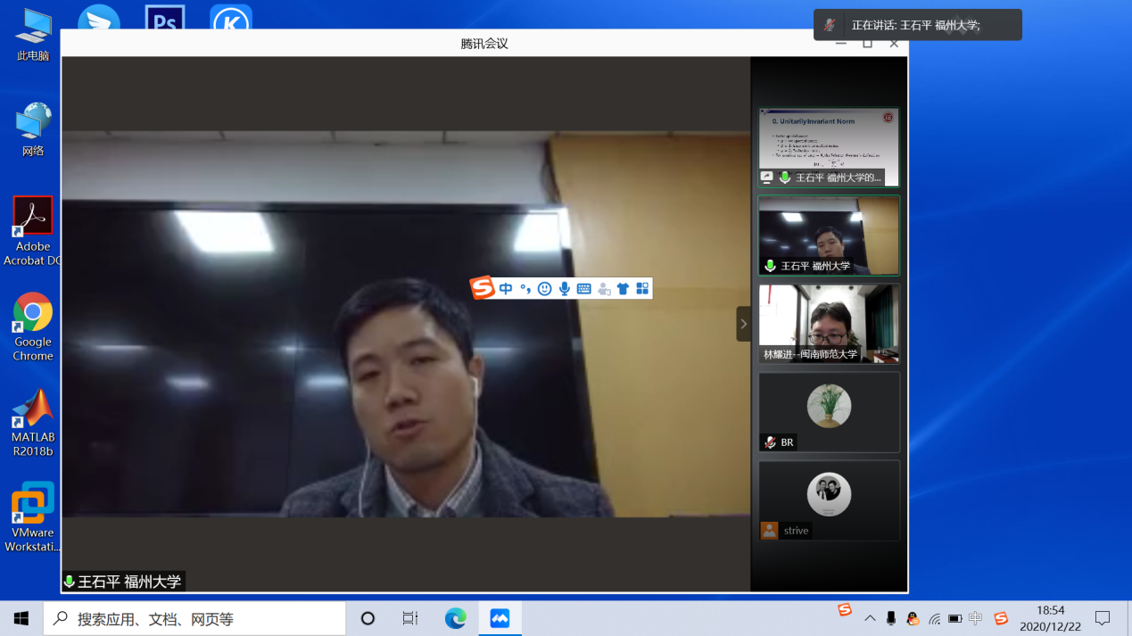 12月22日晚上,福州大学王石平教授应邀为我院师生作题为“Differentiable Distance Metric Learning and Low-rank Recovery(可微分的距离度量学习和低秩恢复)”的线上讲座,讲座由赵红老师主持,部分相关专业的老师及全体研究生出席并认真听取了本次讲座。