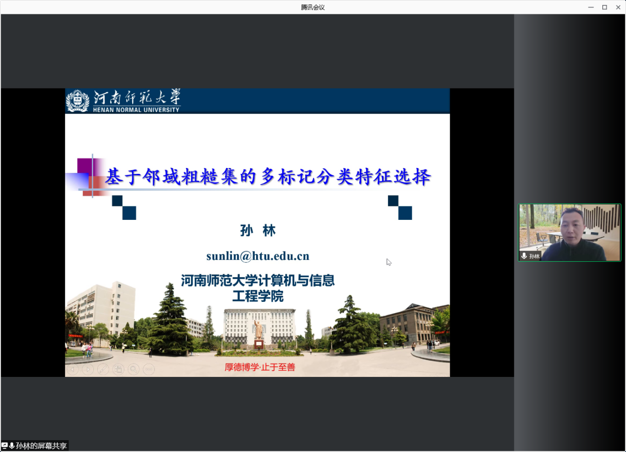 11月25日下午,河南师范大学计算机与信息工程学院的孙林教授应邀为我院师生作题为“基于邻域粗糙集的多标记分类特征选择”的学术报告。本次报告会采用腾讯会议线上方式进行,林耀进院长主持了本次报告会。