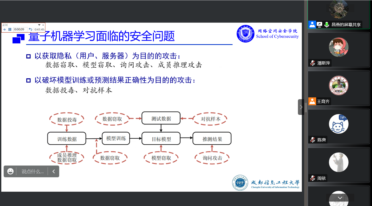 11月21日晚上,成都信息工程大学网络空间安全学院副院长昌燕教授应邀为我院师生做线上专题报告,报告题目为“量子机器学习中的安全问题”。本次报告由学院王育齐副教授主持。