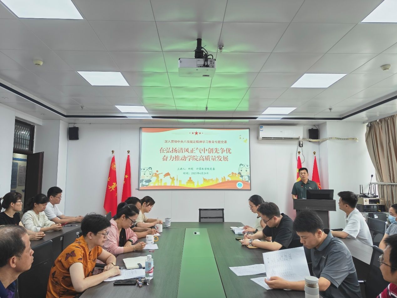 6月24日,3044永利集团官网党委书记祁超以“在弘扬清风正气中创先争优 奋力推动学院高质量发展”为主题面向所联系党支部计算机科学与技术党支部党员讲授专题党课。他详细解读中央八项规定精神核心要义和具体内容,从历史与现实维度剖析学习教育重要意义。他强调,作风问题本质是党性问题,驰而不息推进作风建设是学院发展的坚实保障。全体党员干部要聚焦强化意识作风筑牢“根基工程”、提升能力素养打造“动力引擎”、健全制度机制构建“长效保障”,将服务师生、提质增效、干事创业要求具象化到立德树人各项工作中。