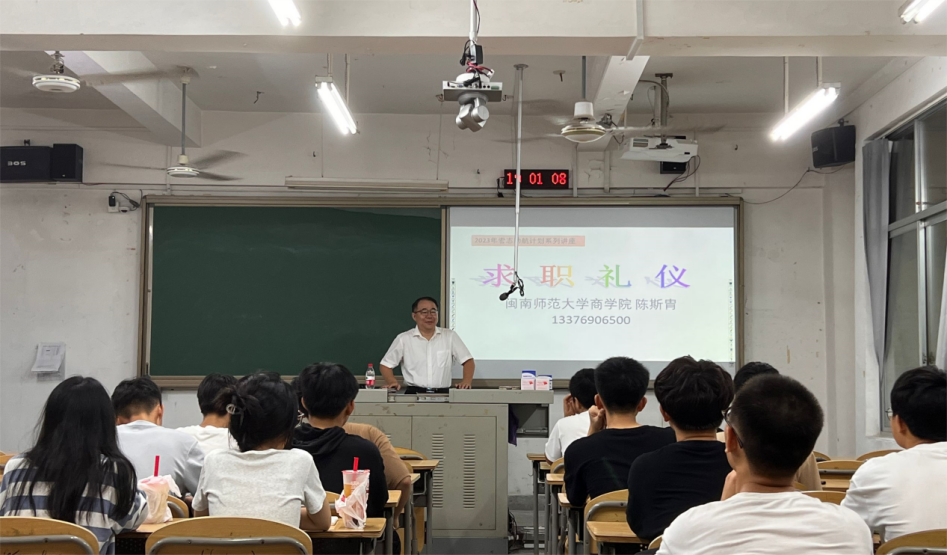 学院特邀福建省礼仪协会理事、闽南师范大学商学院陈斯胄老师、闽南师范大学学生处管理科吴主敏老师、闽南师范大学心理健康教育咨询中心谢康老师以及我院谢映菁老师分别从“求职礼仪”、“选调政策”、“心理减压”、“个人简历”等方面为学院即将求职的学子提供了实用丰富的求职经验,为今后的求职面试打下坚实的基础,提高了毕业生就业信心和就业能力。